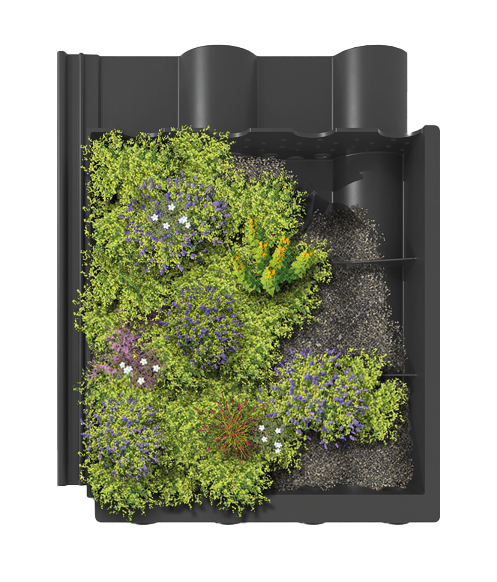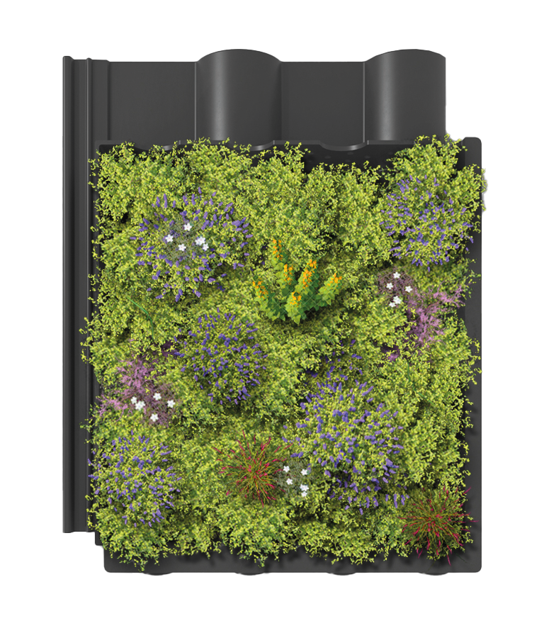 Als perfekte Ergänzung fungiert das LIVINGROOF®. Dieses modulare Gründach-System macht die ökologischen Vorteile von Flachdächern für Schrägdächer (25° bis 50° Neigung) nutzbar.