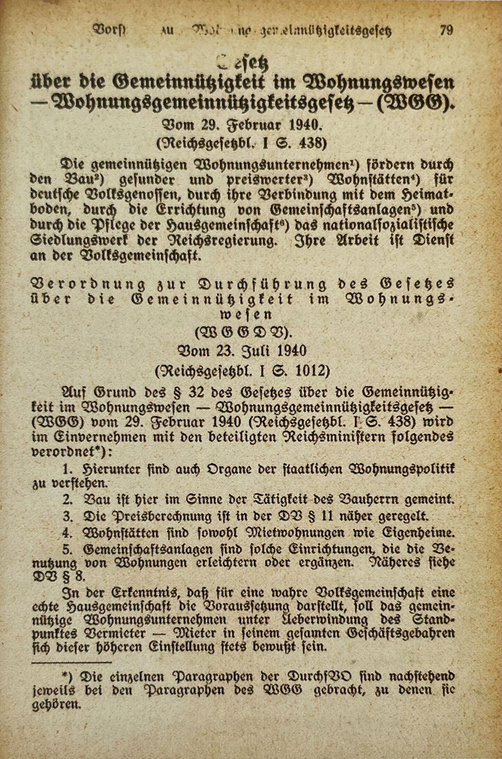 Mit dem am 29. Februar 1940 erlassenen Wohnungsgemeinnützigkeitsgesetz schuf der Gesetzgeber einen Meilenstein des gemeinnützigen Wohnungswesens und damit ein Gegengewicht zum freien Wohnungsmarkt. Das Gesetz sollte das soziale Wohnungswesen in den nächsten 50 Jahren wesentlich beeinflussen.