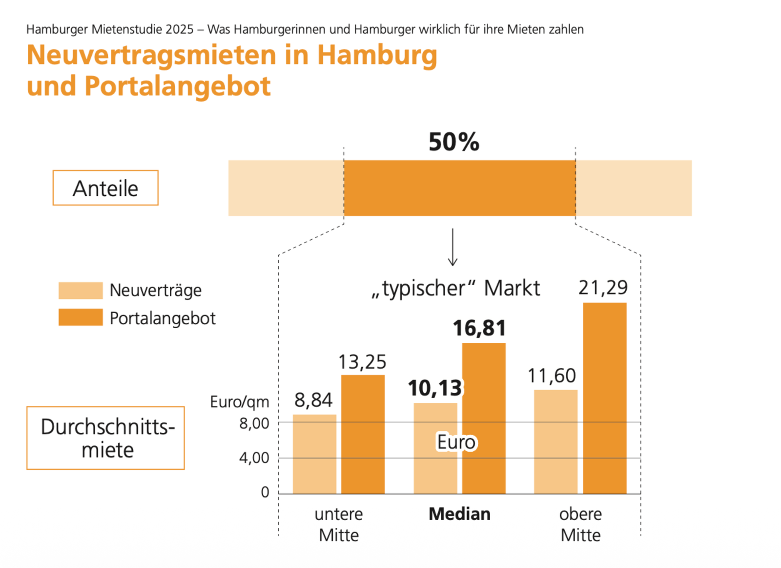 Die Studie zeigt, wie stark sich Angebotsmieten in Immobilienportalen von den realen Neuvertragsmieten entkoppeln. Neue Mietverträge machen nur 5 Prozent des gesamten Mietangebots aus. Die Leerstandsquote liegt in Hamburg unter 1 Prozent. Es herrscht also quasi Vollvermietung.