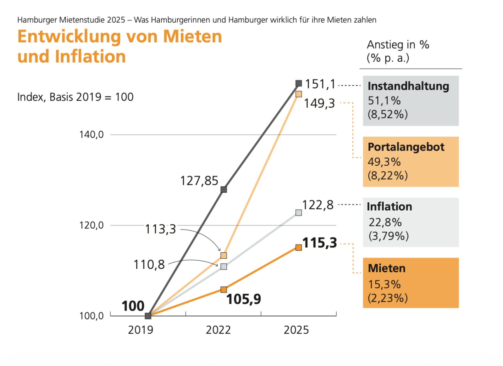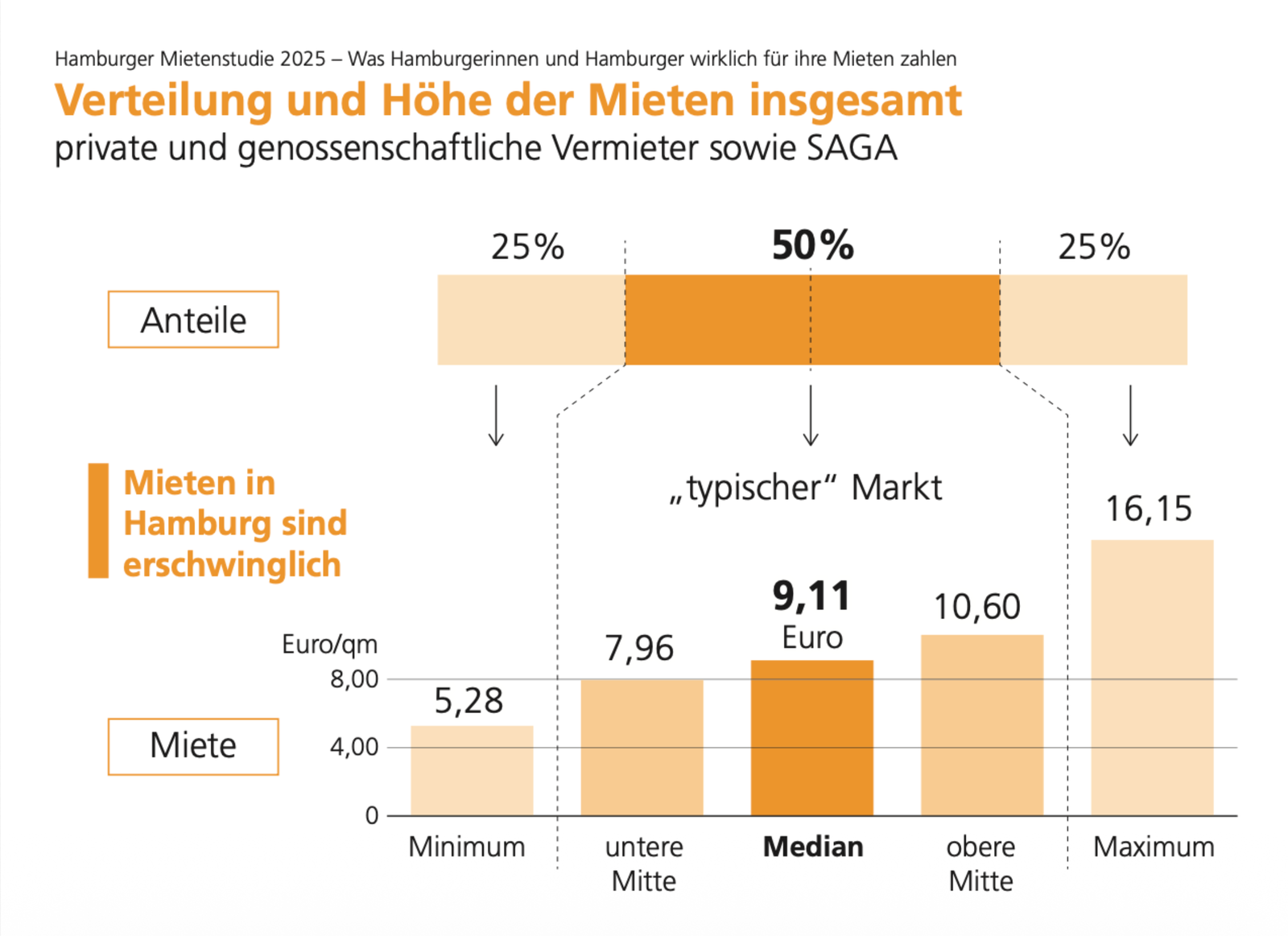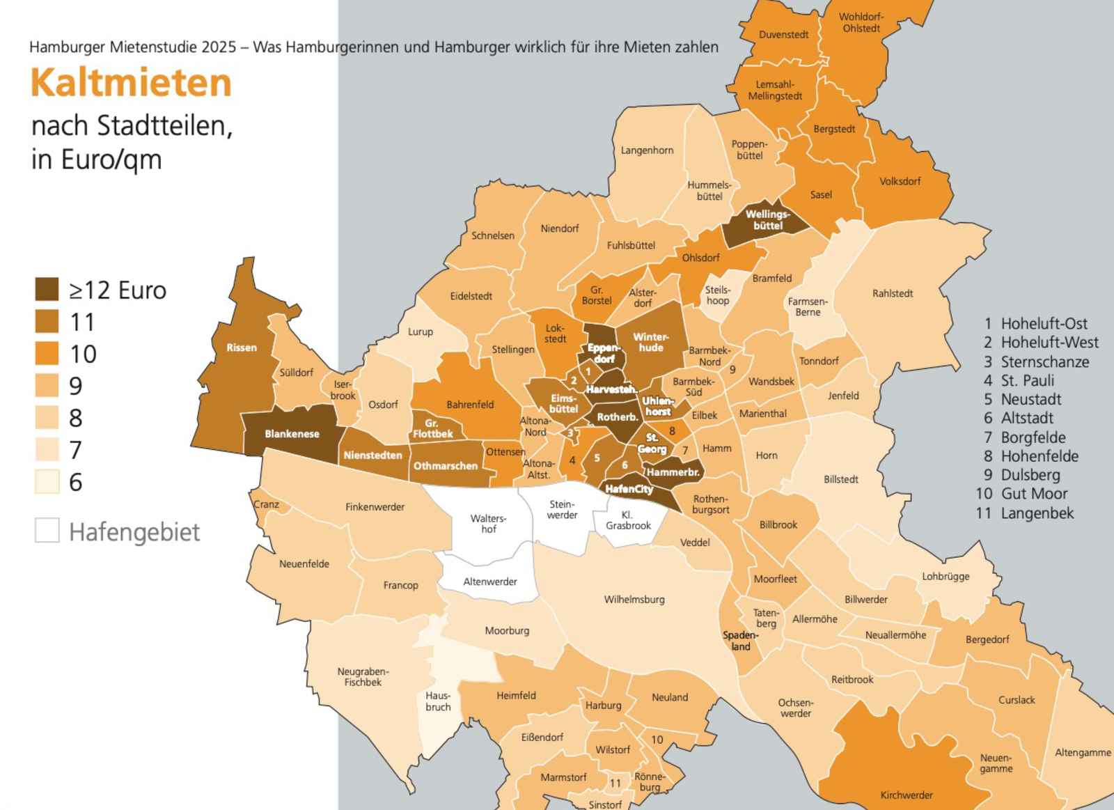 Hamburg. „Alarmierender Anstieg bei Hamburgs Mieten“, warnte der Mieterverein zu Hamburg im Mai dieses Jahres. Und bezog sich mit „15,62 Euro pro Quadratmeter“ auf Daten von 3.800 „anonymisierten Mietwohnungsinseraten“. Unnötiger Alarmismus, wie die HAMBURGER MIETENSTUDIE 2025 nun zeigte.