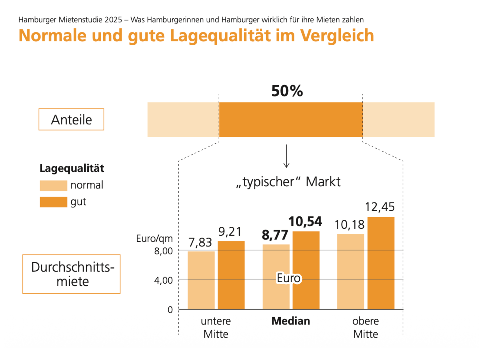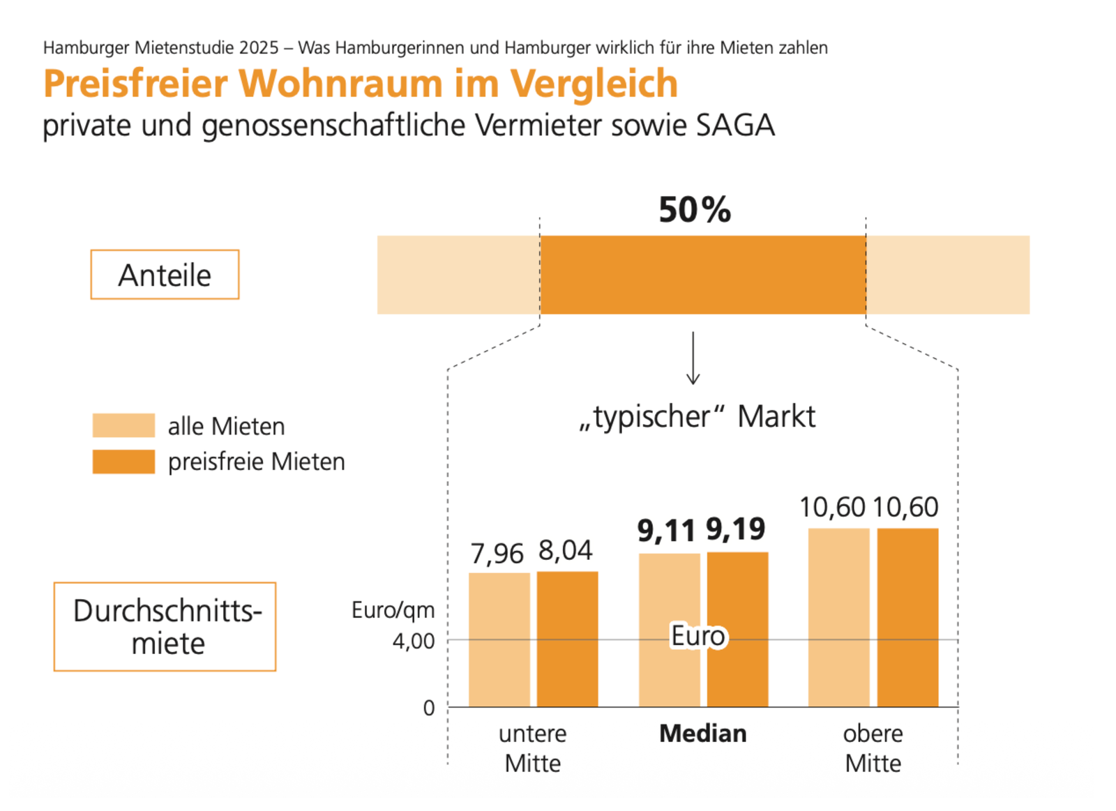 Das Ergebnis: Die reale monatliche Nettokaltmiete beträgt in Hamburg derzeit im Durchschnitt 9,11 Euro pro Quadratmeter. Die Zahl setzt sich aus der durchschnittlichen Bestandsmiete von 9,04 Euro und der durchschnittlichen Neuvertragsmiete in Höhe von 10,13 Euro pro Quadratmeter zusammen. Mieterinnen und Mieter zahlen also im Schnitt 6,51 Euro weniger, als der Mieterverein zu Hamburg beklagte.