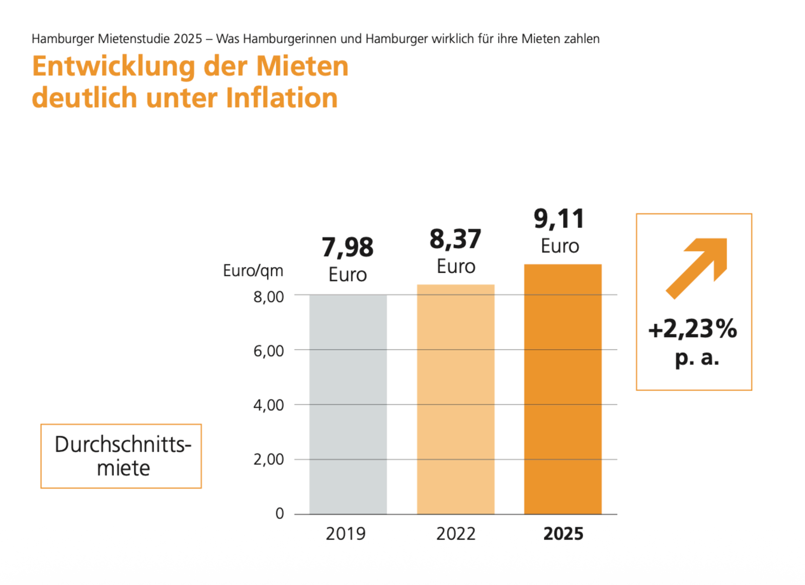 „Die Lage ist besser als der Ruf des Hamburger Mietwohnungsmarktes“, fasste VNW-Direktor Andreas Breitner das Ergebnis zusammen. Carl-Christian Franzen, stellvertretender Vorsitzender des IVD Nord für Hamburg ergänzte: „Trotz hoher Baukosten entwickeln sich die Bestandsmieten weiter moderat – seit 2019 im Schnitt nur um 2,55 Prozent pro Jahr und damit deutlich unter der Inflation. Das bestätigt: Die allermeisten Hamburgerinnen und Hamburger wohnen zu stabilen, verlässlichen Konditionen.“ Bei Mieterhöhungen gehen Vermieter maßvoll vor, sagt auch Torsten Flomm, Vorsitzender des Grundeigentümer-Verbandes.